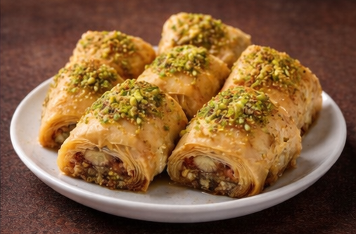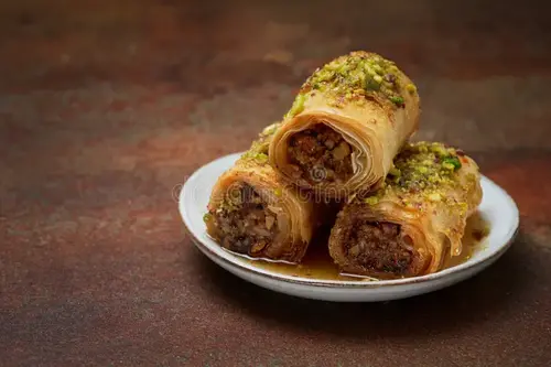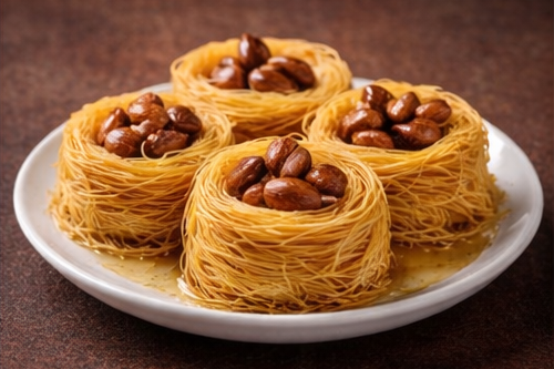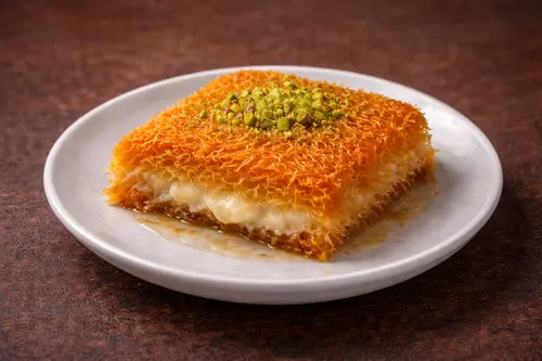 A shredded phyllo pastry dessert layered with cheese or cream and soaked in sugar syrup.
