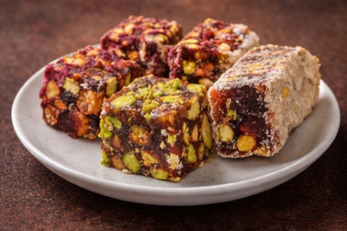 A soft, chewy sweet made from sugar and starch, filled with nuts.