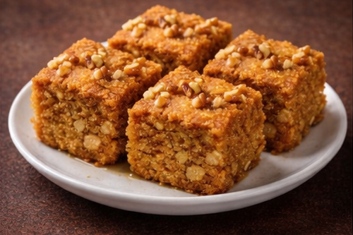 A soft semolina cake soaked in sugar syrup and often topped with almonds or walnuts.